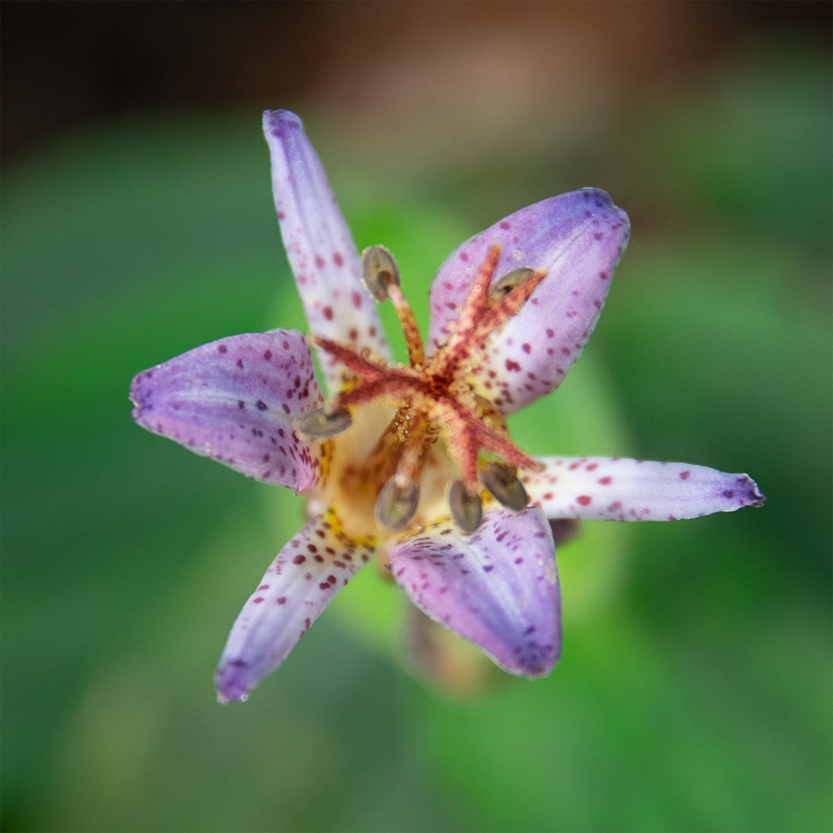 Tricyrtis lasiocarpa, ook wel paddenlelie of armeluisorchidee genoemd, is een niet zo bekende vaste plant die in de periode augustus – oktober bloeit met op orchideeën lijkende, blauwlila gekleurde en gevlekte bloemen.